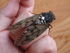 ・・・もう解ると思う。写真はどこにでもいるアブラゼミの頭部である。額に光る三つのカラータイマーは単眼である。このことから、アブラゼミは5カ所に目を持っていることになる。普通の目に当たる部分が複眼。ここでセミは形などが見えると言う。