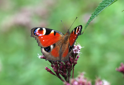 ▲花の蜜を吸うクジャクチョウ