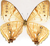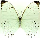 この亜属はモルフォチョウの特長でもある青色の輝きがなく、白色をしています。