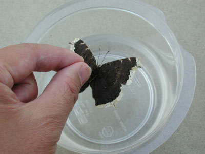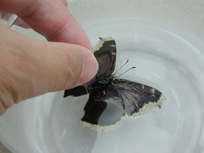 標本をそっと乾かします。ストローなどで吹くと、毛が束に固まったりすることを防げます。あまり強く吹くと、ストローの中にたまった水滴などが標本にかかったりするのでそっと吹きます。蝶の体にアセトンが浸透していると乾くのに時間がかかったりします(10分くらい)。早いときはあっという間です。